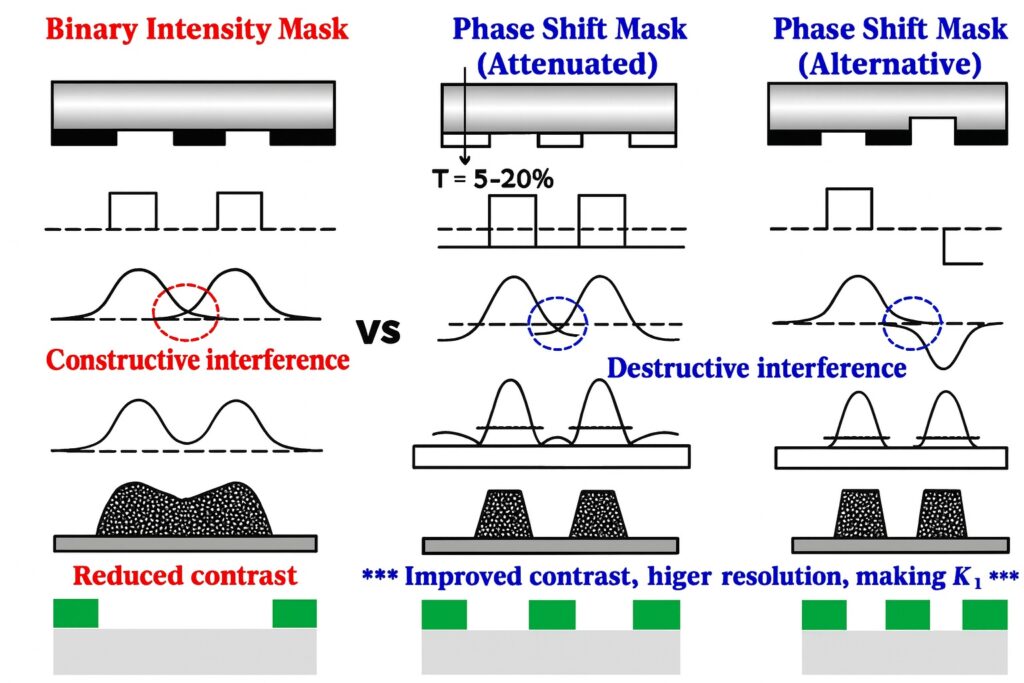 위상 조절로 간섭 효과를 유도해 고해상도와 넓은 DOF를 확보하는 고급 photomask로, 90nm 이하 미세 공정과 Immersion lithography 등 첨단 노광에서 필수적이며 Binary Mask보다 정밀한 패턴 구현에 유리합니다.